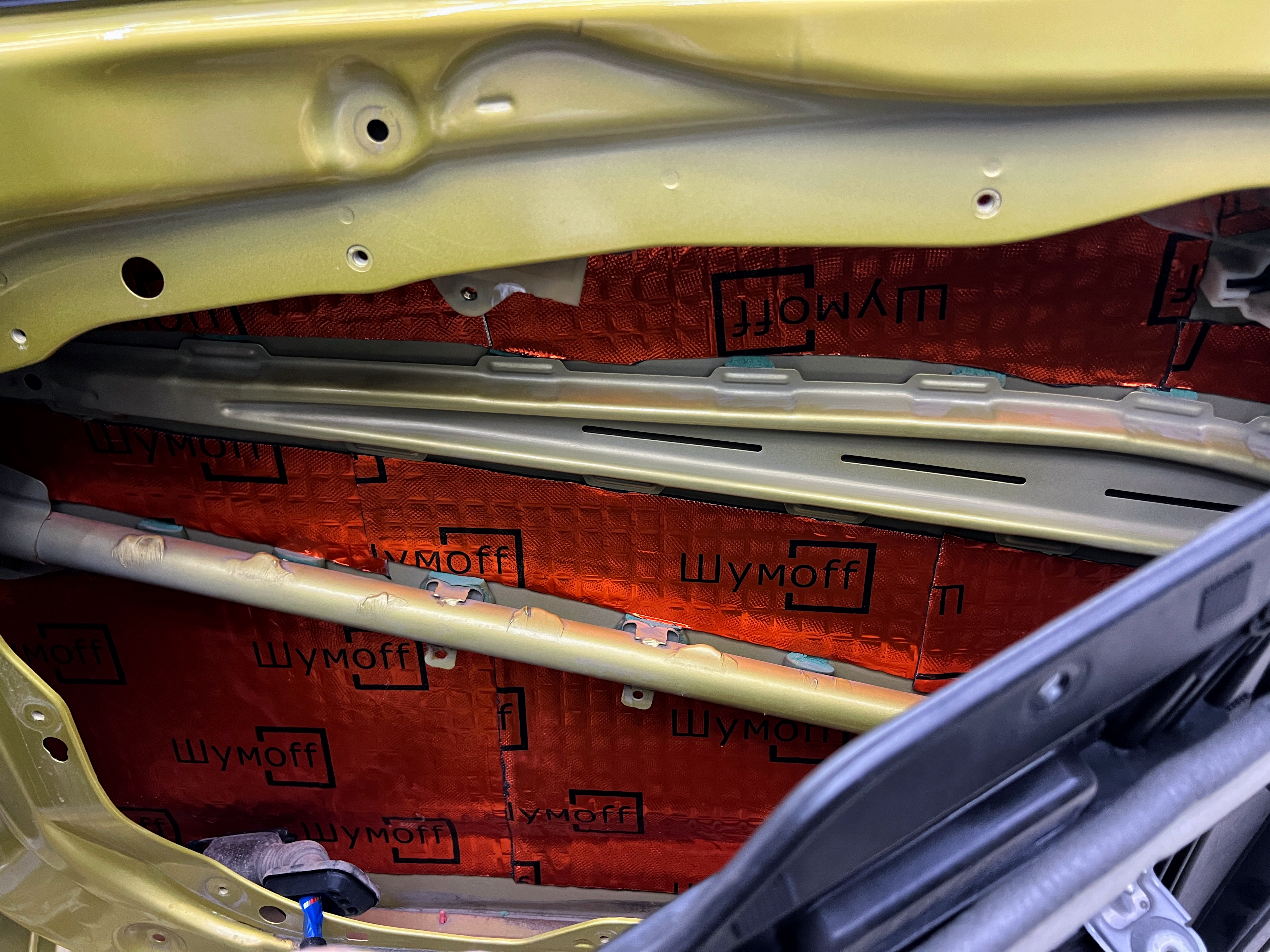 Вторым слоем на корпус панели как правило монтируется шумопоглотитель Absorber A15, однако в зависимости от конструктивных особенностей автомобиля, как и в данном случае, сделать это не всегда возможно, от чего наносится шумопоглотитель Герметон 7.
