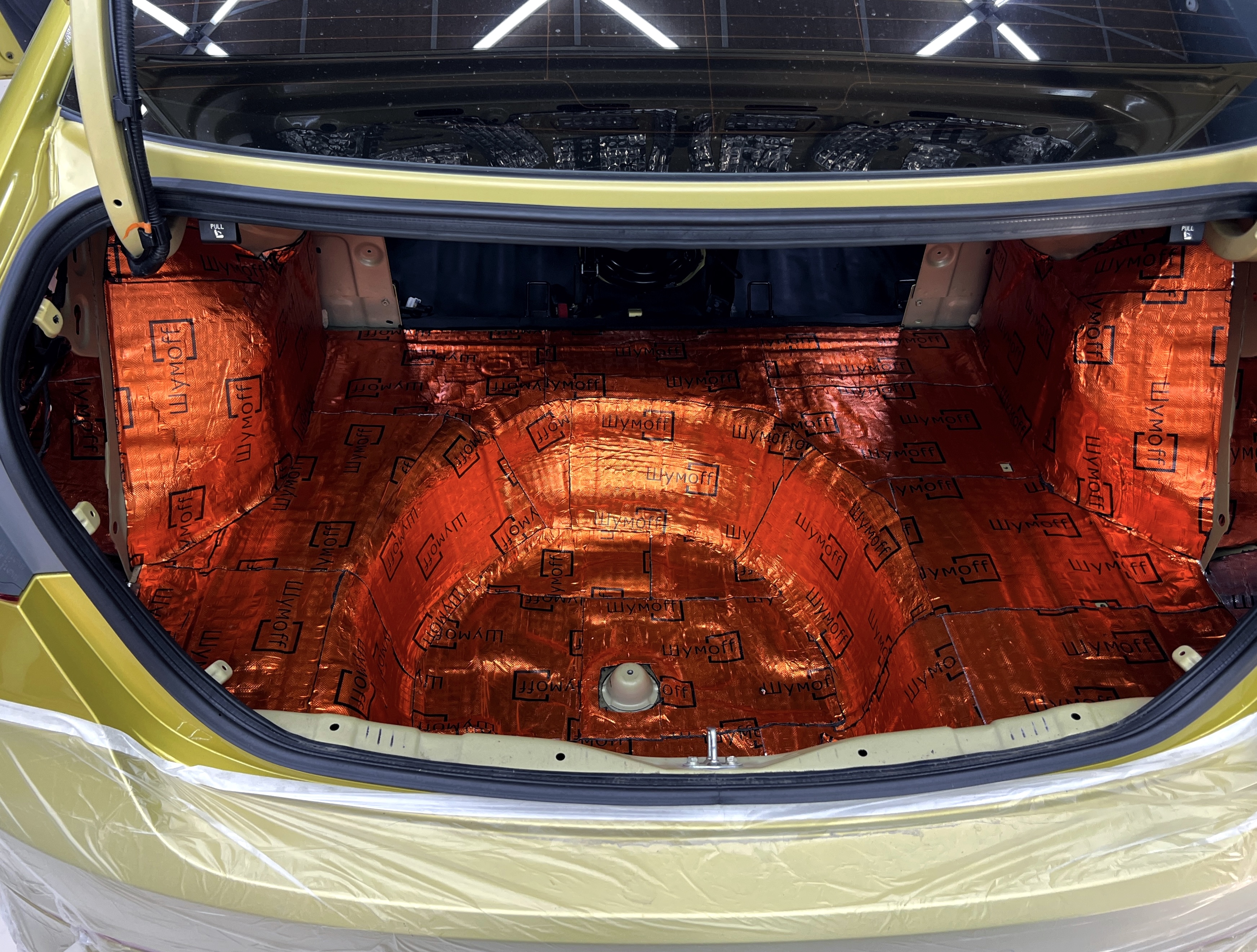 Для виброизоляции крыши багажника используем самый легкий материал Шумофф M2, что бы свести увеличение веса к минимуму. После чего переходим к обшивке.