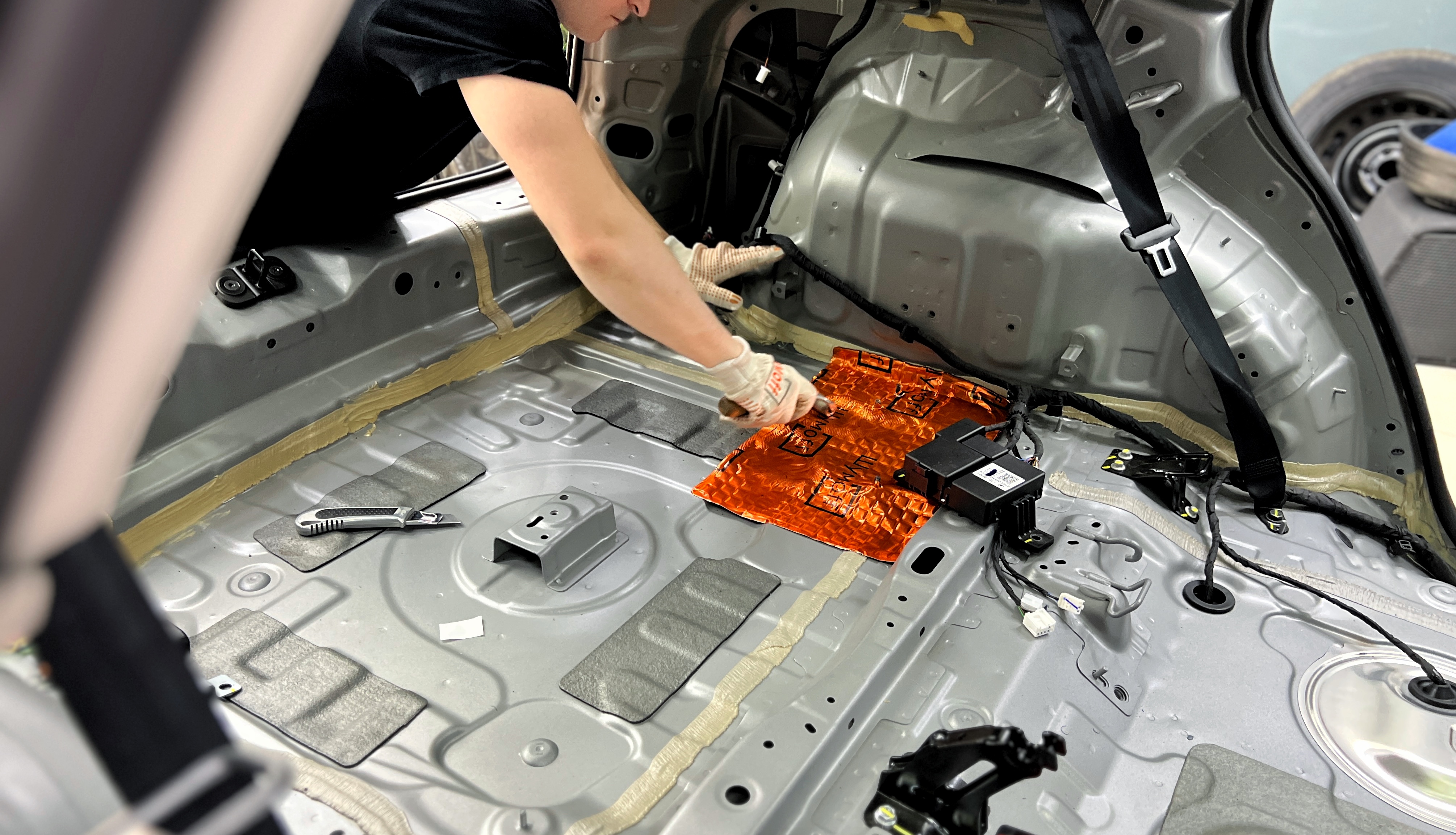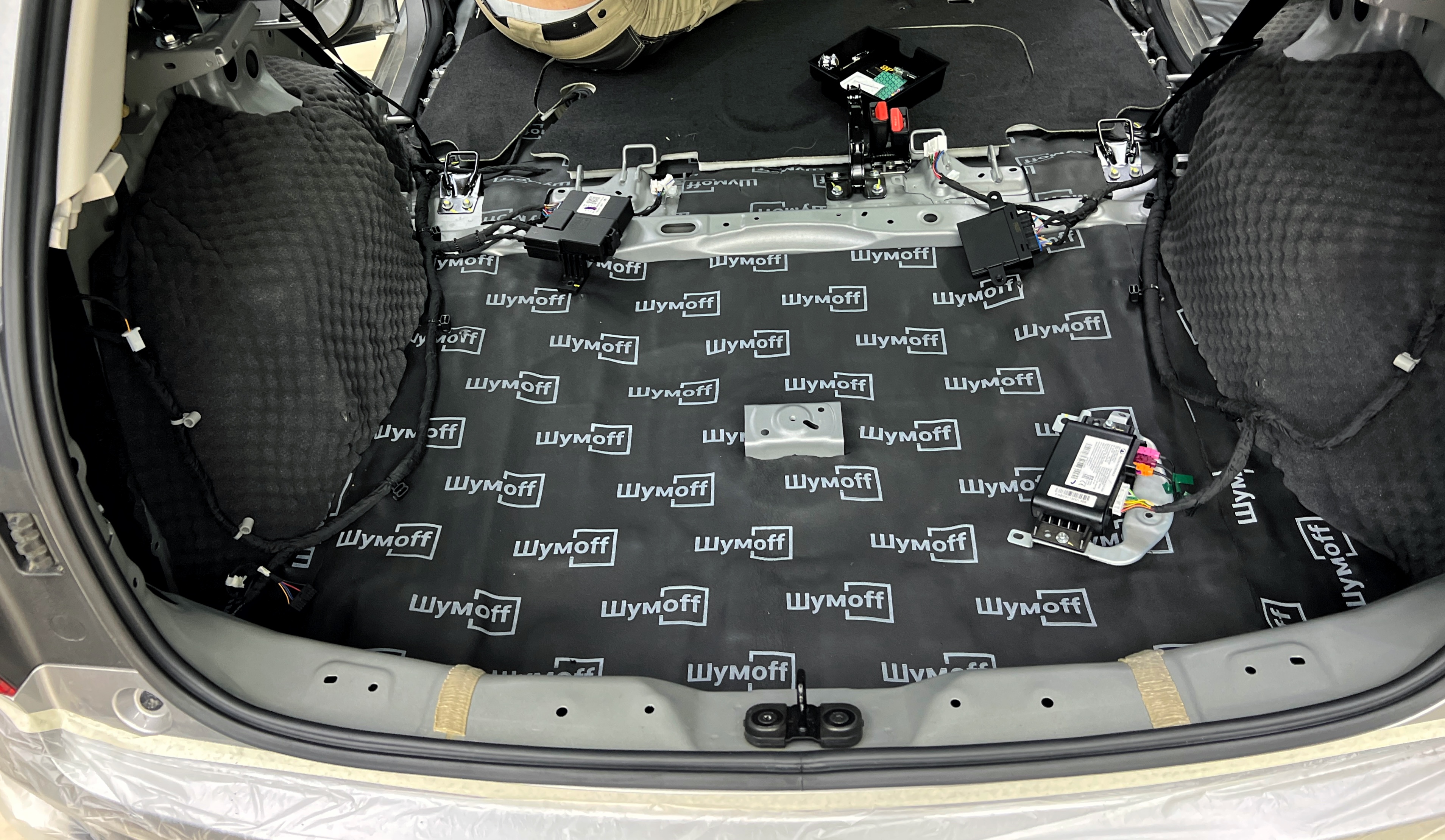 Дно багажника и крылья оклеиваются шумо и теплоизолятором Шумофф П4 4. Арки оклеиваются шумопоглотителем Flex A15.