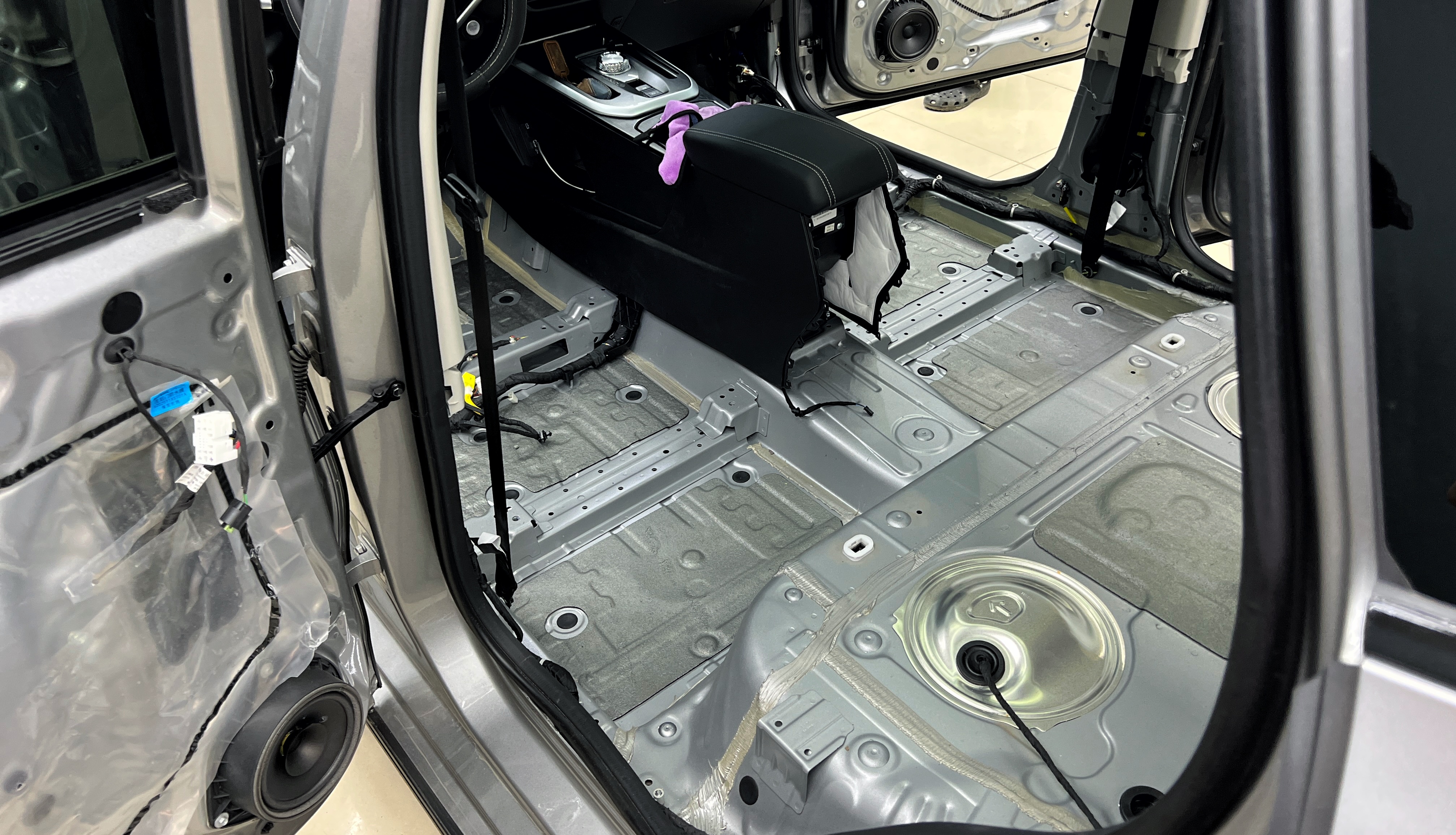 От моторной перегородки и до заднего сиденья вмести с ним клеится мощный многослойный шумо и звукоизолятор Шумофф Prizma 6.