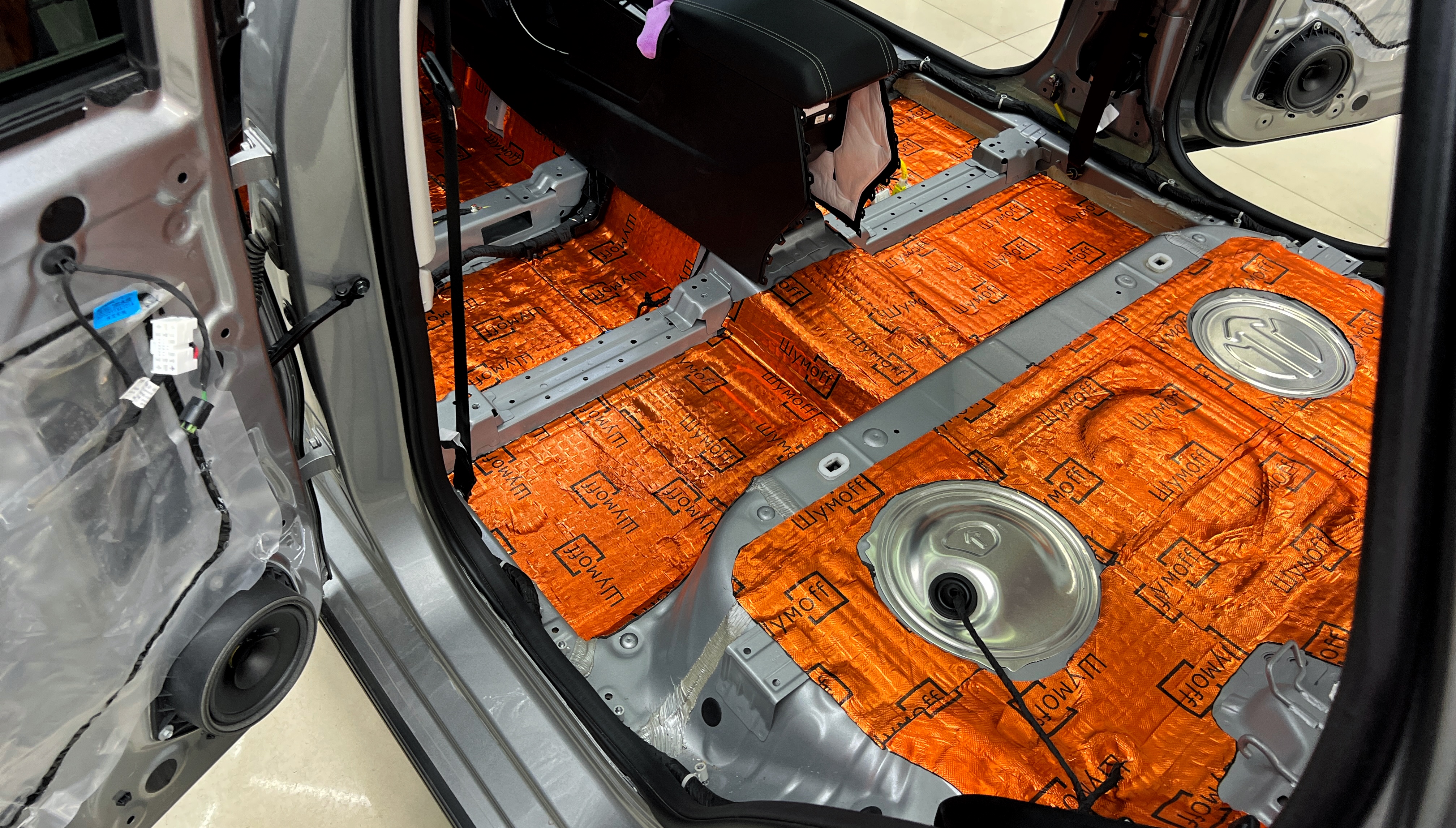 Дно оклеивается многослойным шумо и звукоизолятором Шумофф Prizma 6, крылья, арки и крышка багажника шумопоглотителем Absorber A15.